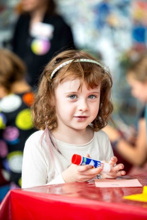 In der Offenen Kinderwerkstatt können Kinder aktiv werden, während die Eltern die Ausstellung besuchen: Es wird gemalt, gezeichnet, gerubbelt und gebaut und anschließend den Eltern präsentiert.